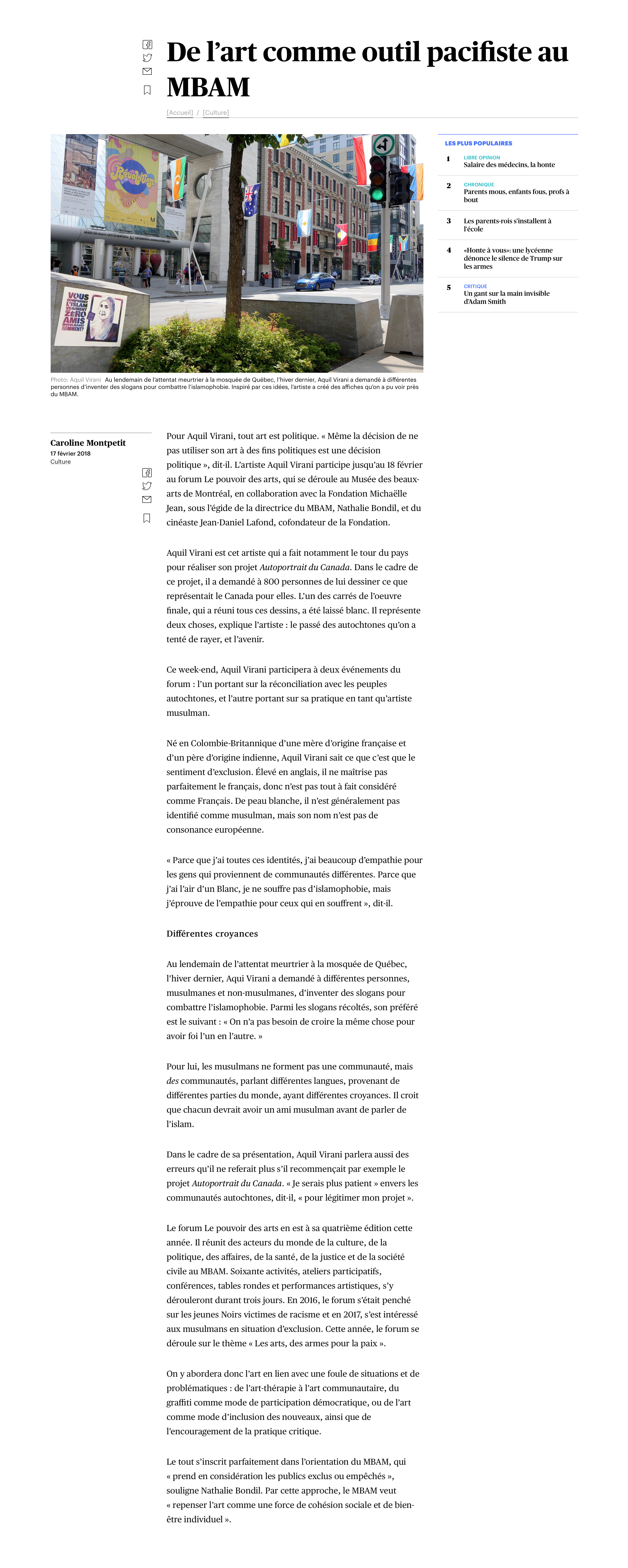 – Le Devoir, 2018. « L’art comme outil pacifiste. » lien