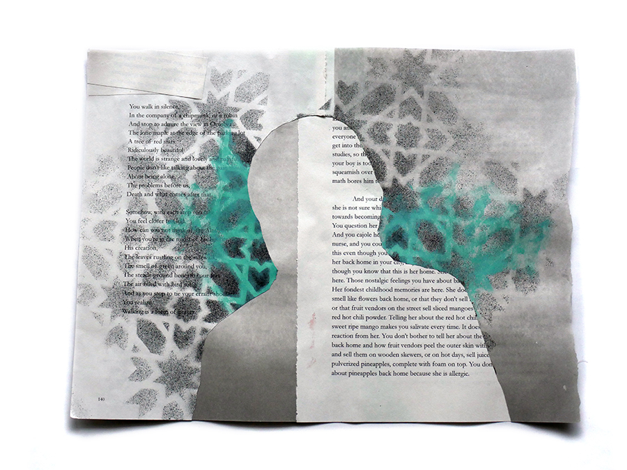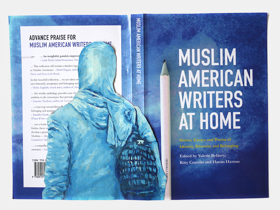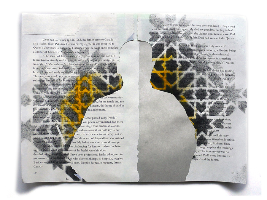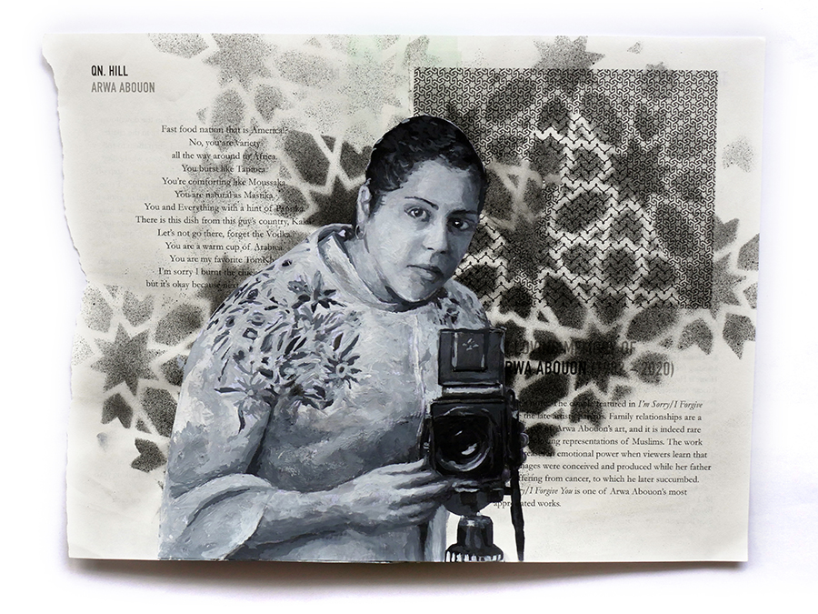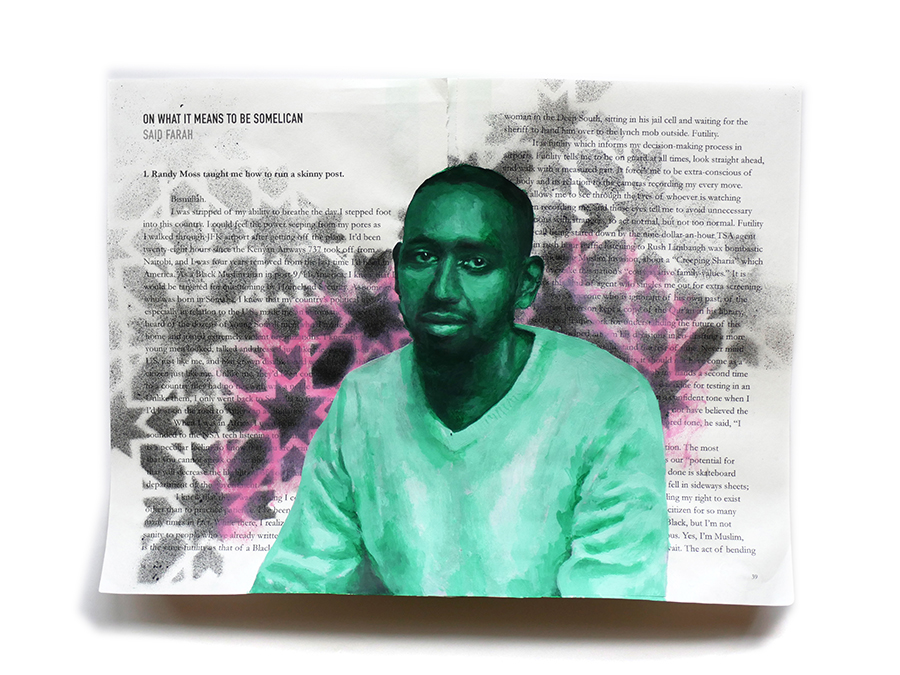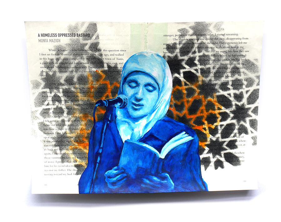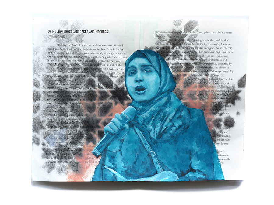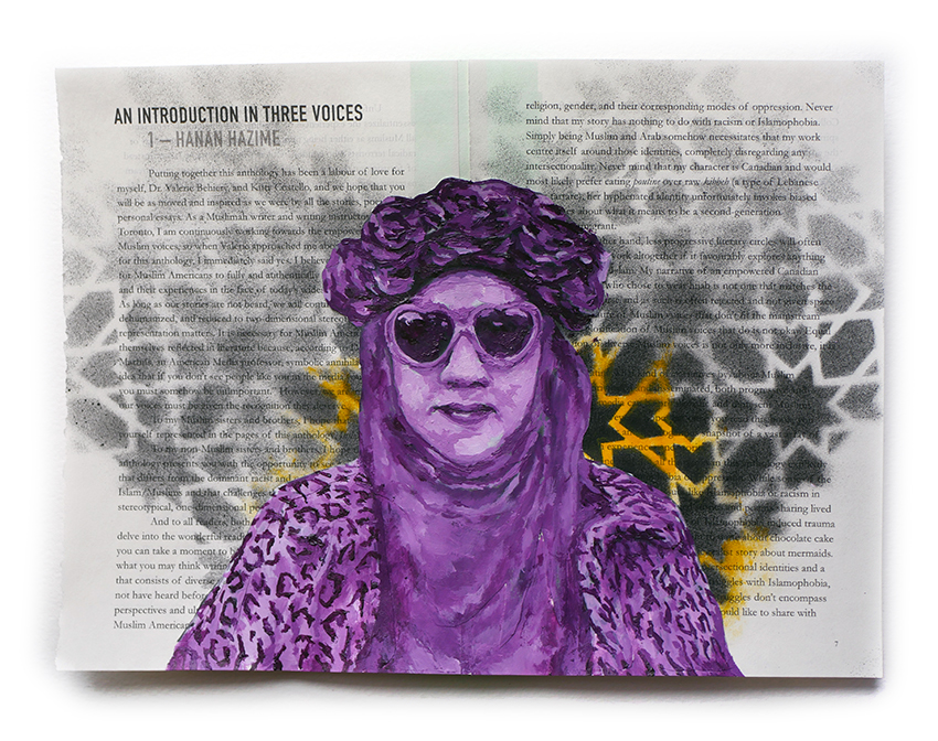 I volunteered to design a literary anthology of Muslim voices from across North America (referred to, in many Indigenous cultures, as “Turtle Island”). In 2020, the anthology “Muslim American Writers At Home” was published by Freedom Voices, described as “an insightful, painful, impressive, hopeful read” by Laila Hasib. I then remixed the printed pages into a backdrop of painted portraits of some of these writers, depicted amidst their own published words. I wanted to promote the idea of Muslims being represented on our own terms, amongst our own words, embedded in our chosen language.