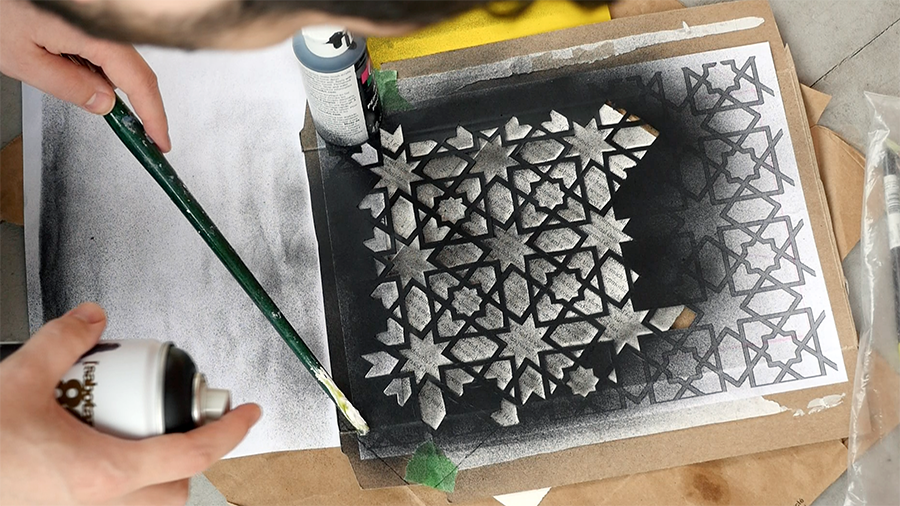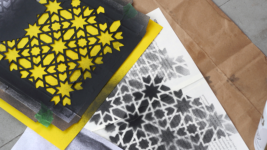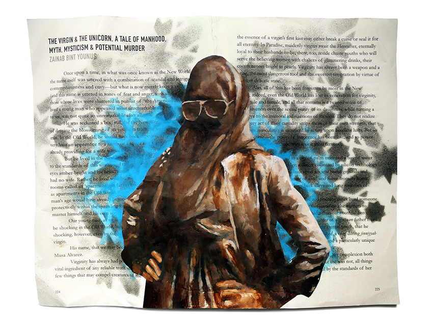 In(k)shallah: Painted portraits of Muslim writers amidst their own published work.