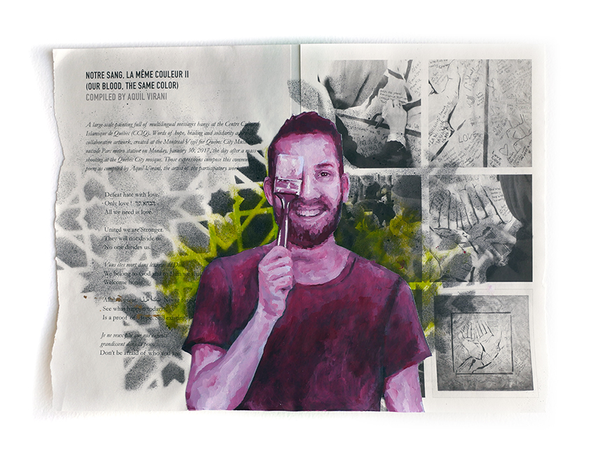 These artworks celebrate the portrait subject’s insight, brilliance, and contribution in a way that centres their personhood and personality. Because they are depicted amongst their own words, we are prevented from reducing them to “Muslims,” but rather “Muslim” and “creative,” “Muslim” and “linguistically gifted,” “Muslim” and “enthusiastic about dinosaurs,” or “Muslim” and “appreciative of heavy metal music,” for example. Not only do I want to celebrate these individual writers, but also to debunk myths about Muslims in North America. I want to expand what we picture when think of “Muslims in North America.”